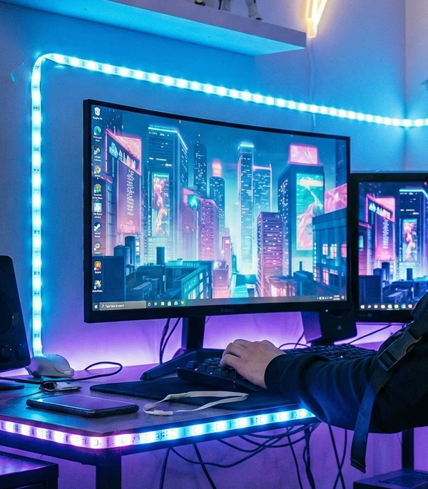 The night city of the future on your desk. Maximum concentration of RGB lighting, neon signs, and technology. An atmospheric and slightly aggressive style for gamers and sci-fi fans.